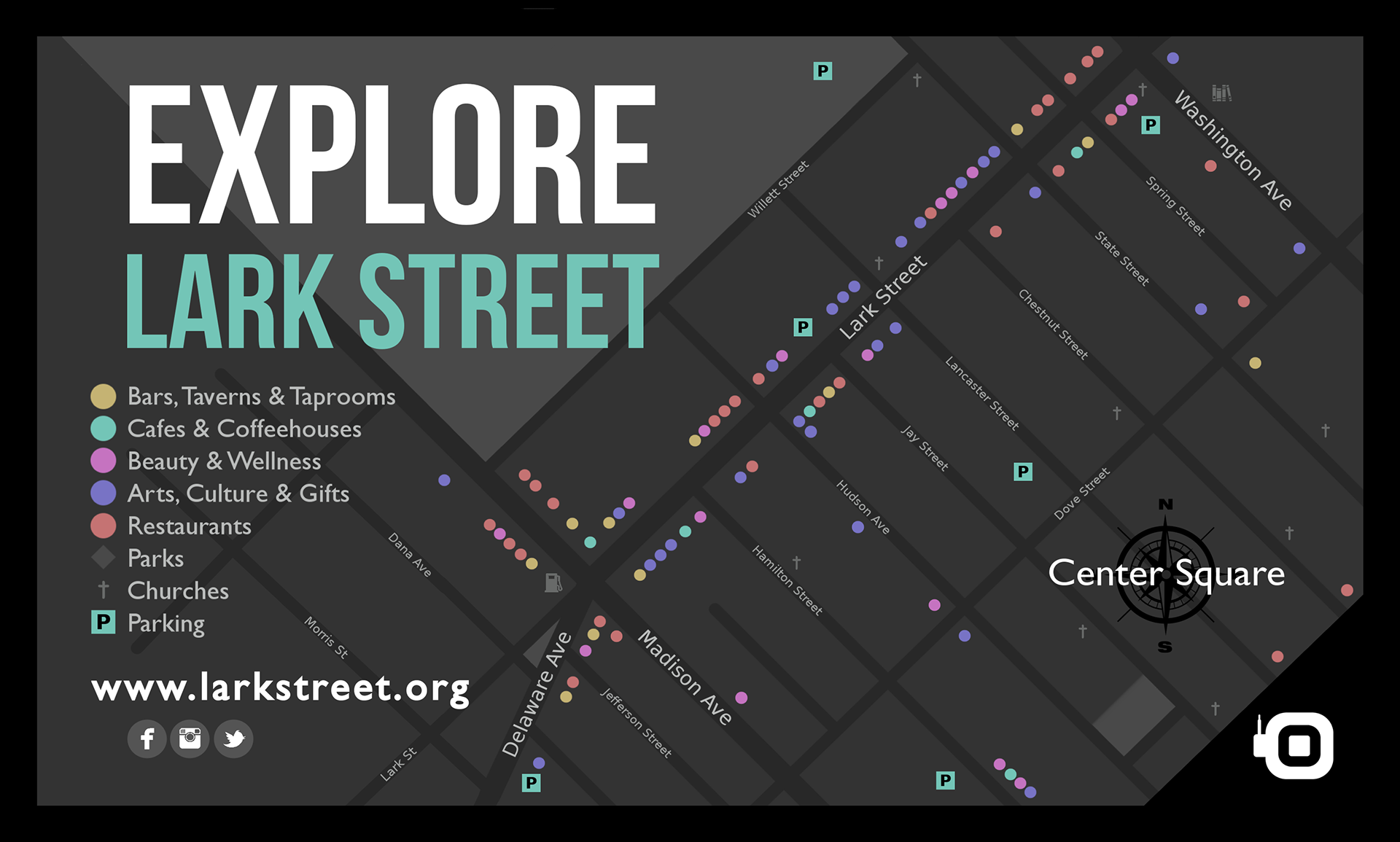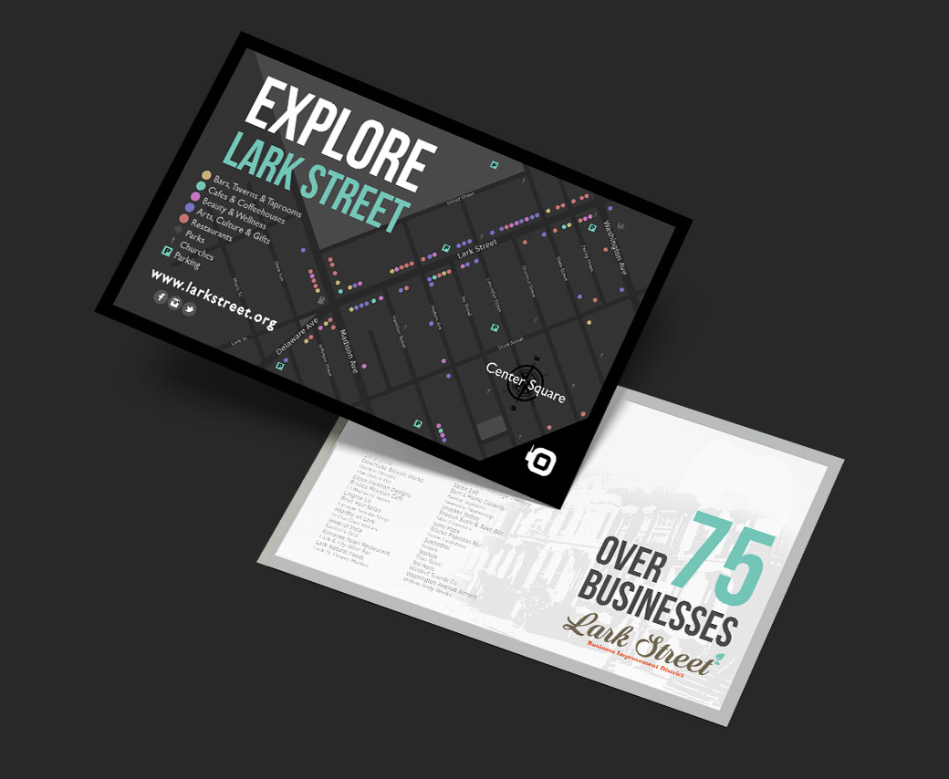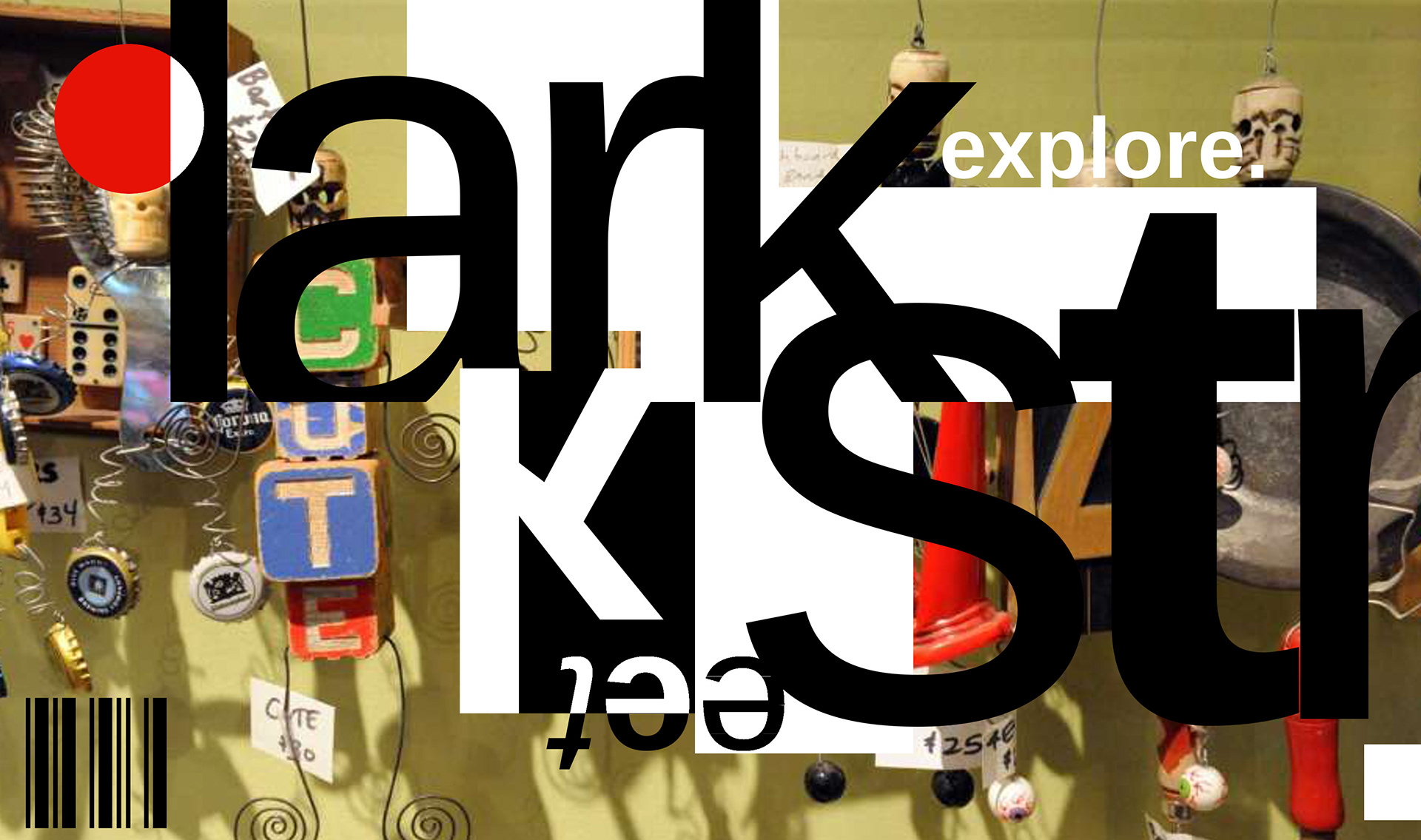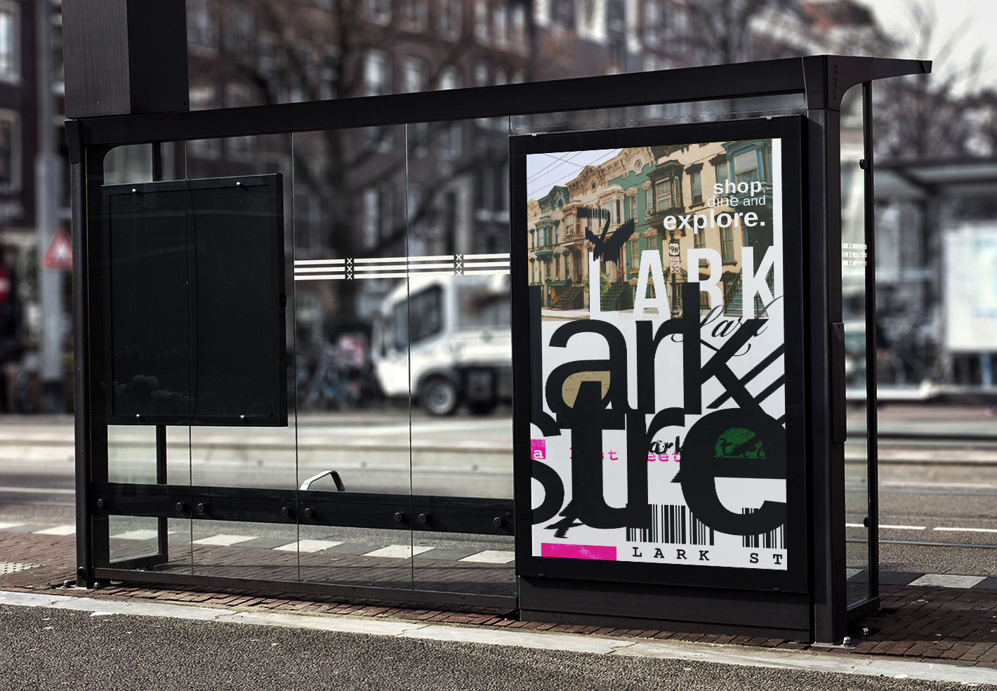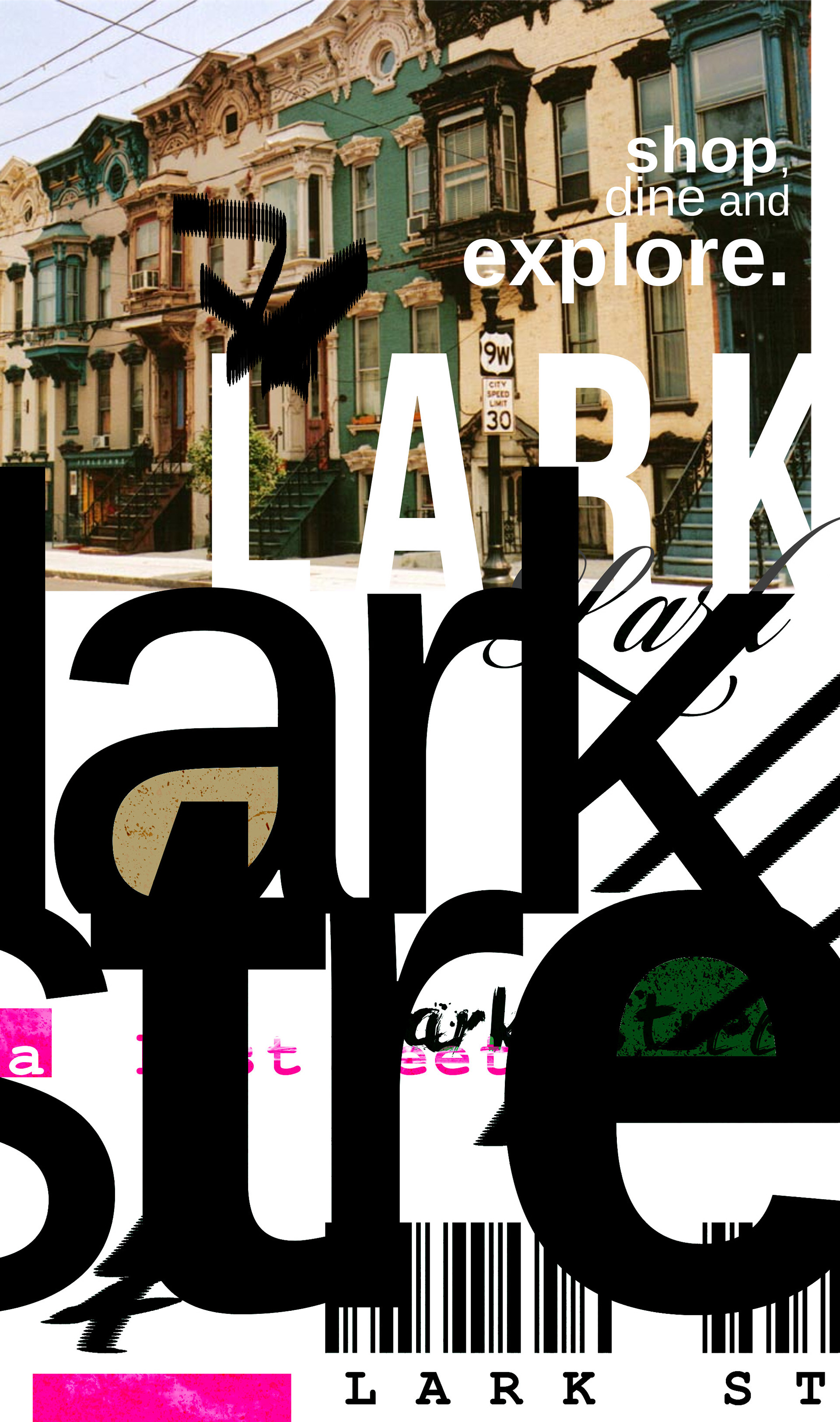 This speculative promotional project explores Lark Street as a typographic landscape. Instead of building a traditional logo system, I treated the district itself as the identity—using oversized type, layered imagery, and post-digital graphic markers to create a campaign that feels as dense and chaotic as the street.
