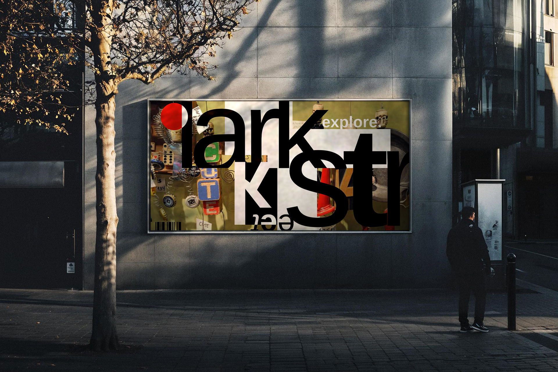 The campaign imagines type as signage, texture, and wayfinding—something you move through, not just read. Designed for public-facing placements like bus shelters and street posters, this direction treats the district as a living editorial spread.